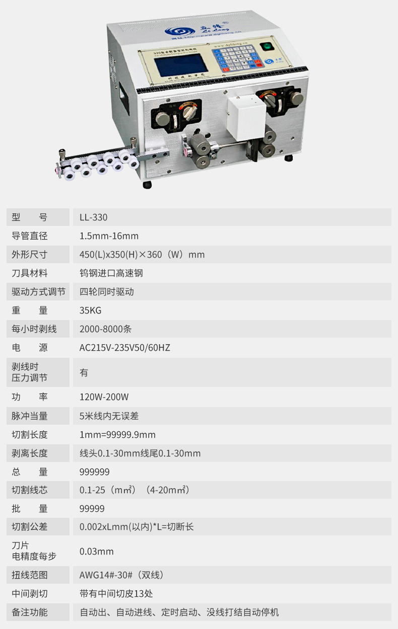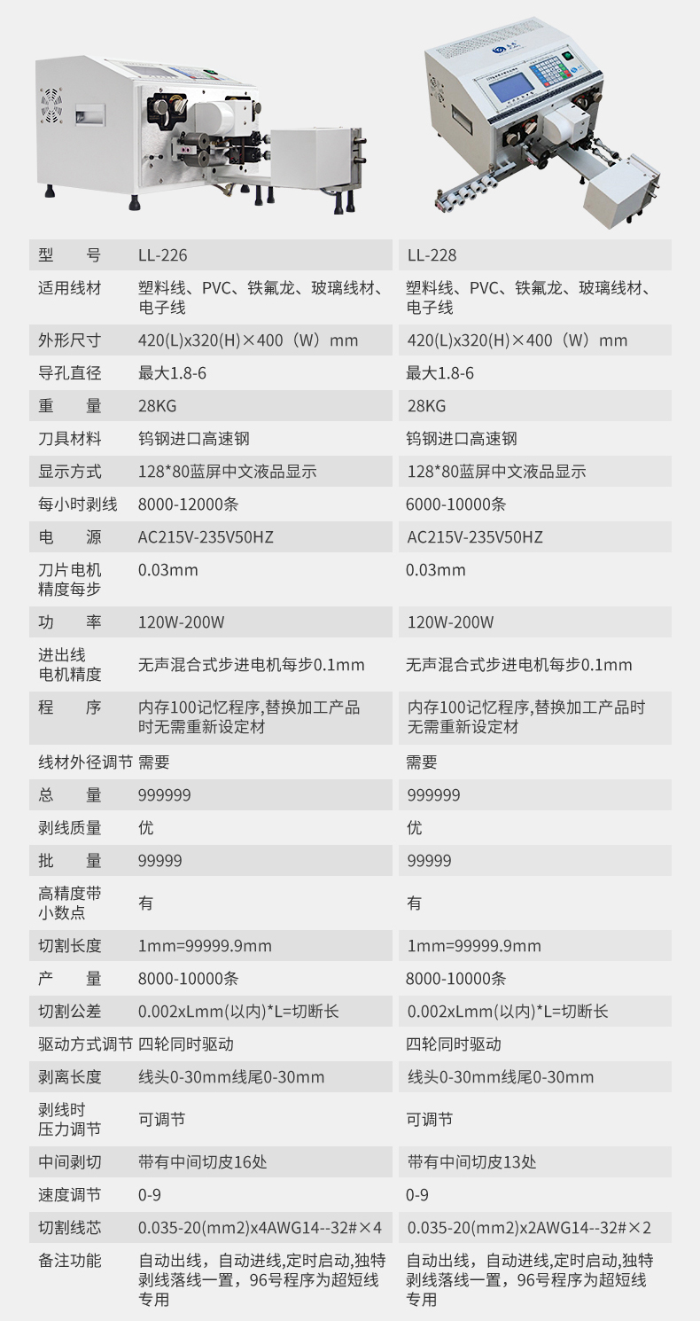 LL-223全數(shù)字智能剝線機(jī)(電機(jī)開排型) 產(chǎn)品說明: 1.本機(jī)采用藍(lán)屏中英文轉(zhuǎn)換顯示,數(shù)字智能控制裝置,按鍵操作,性能穩(wěn)定,操作方便。 2.機(jī)臺設(shè)計非常靈活性,針對雙并線、排線、平行線、RVB線等;全自動分線、裁線、...