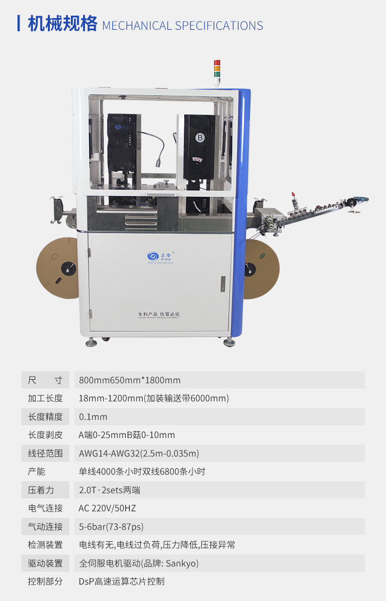 本機(jī)采用全封閉式防護(hù)罩機(jī)臺(tái)設(shè)計(jì),外觀整體美觀又大大提高了安全性,全封閉式防護(hù)罩具有開(kāi)蓋報(bào)警裝置。獨(dú)立防線裝置,放打結(jié)斷線效率更高,穩(wěn)定送線、提升效率,增強(qiáng)產(chǎn)品線長(zhǎng)精度。具有收紙自動(dòng)感應(yīng)功能,采用全伺服電機(jī)和進(jìn)口精密部件,讓機(jī)器更穩(wěn)定更精確。本機(jī)可裝伺服端子機(jī),大大提高了生產(chǎn)效率,操作簡(jiǎn)單易懂。